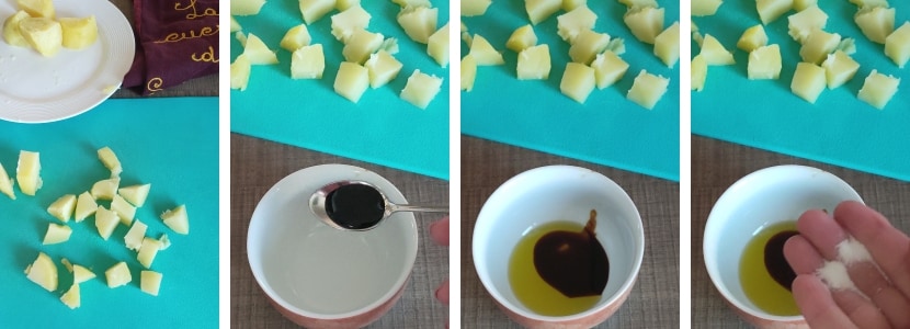– Depois de cozinhar as batatas (na panela de pressão bastam 4′ após o apito), corte-as em cubos e coloque-as em uma tigela. Em uma tigelinha, faça um vinagrete com o vinagre balsâmico, o azeite, o sal e a pimenta, emulsionando com o garfo.