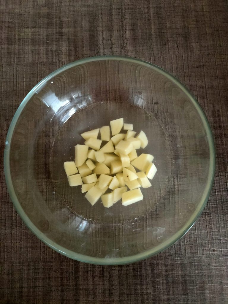 • – Enquanto isso, descasque e corte em cubinhos uma batata e deixe momentaneamente de molho em água fria.