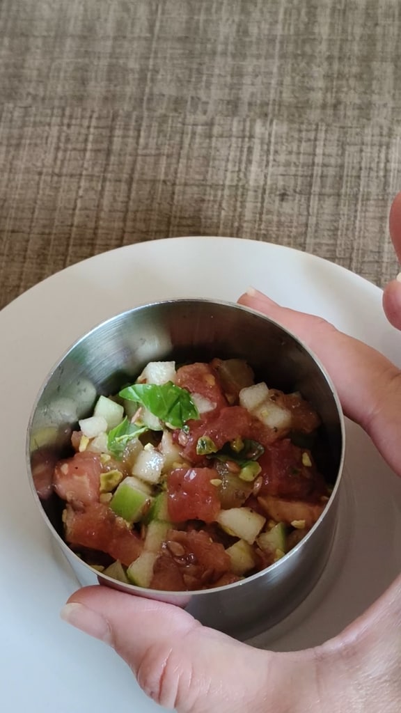 A tartare de tomates e maçã verde com pistaches e manjericão é a receita que você esperava para trazer à mesa uma entrada ou um prato leve, fresco e sem cozimento, perfeito para o verão. Quando as temperaturas sobem, a última coisa que queremos é ligar o fogão: por isso adoro criar pratos coloridos e equilibrados que se preparam em poucos minutos, com ingredientes sazonais e novas combinações.