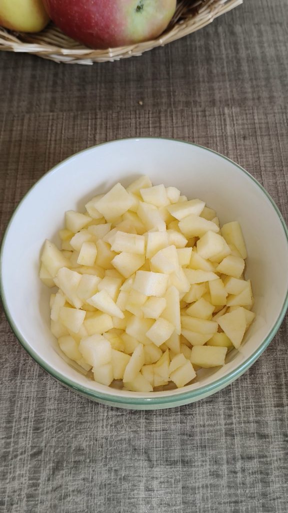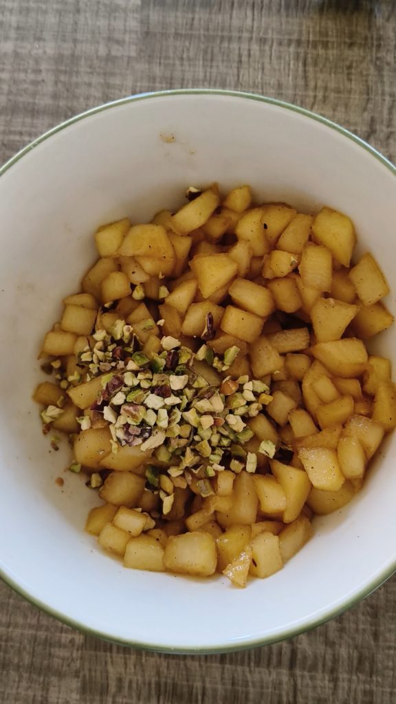 • Transferir os cubos de maçã para uma tigela e adicionar o granulado de pistache e misturar. Esperar que esfriem antes de usá-los.
