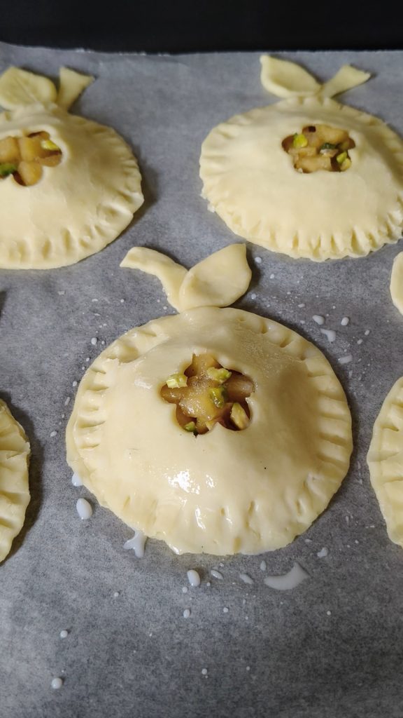 • Umedecer as bordas das bases com um pouco de leite e rechear com uma colher de maçãs. Adicionar também as folhinhas e os cabinhos a cada base, pressionando levemente.