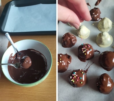 – Mergulhe as trufas nos dois tipos de chocolate, e pouco antes de o chocolate solidificar, decore a superfície das trufas com poucos confeitos coloridos.