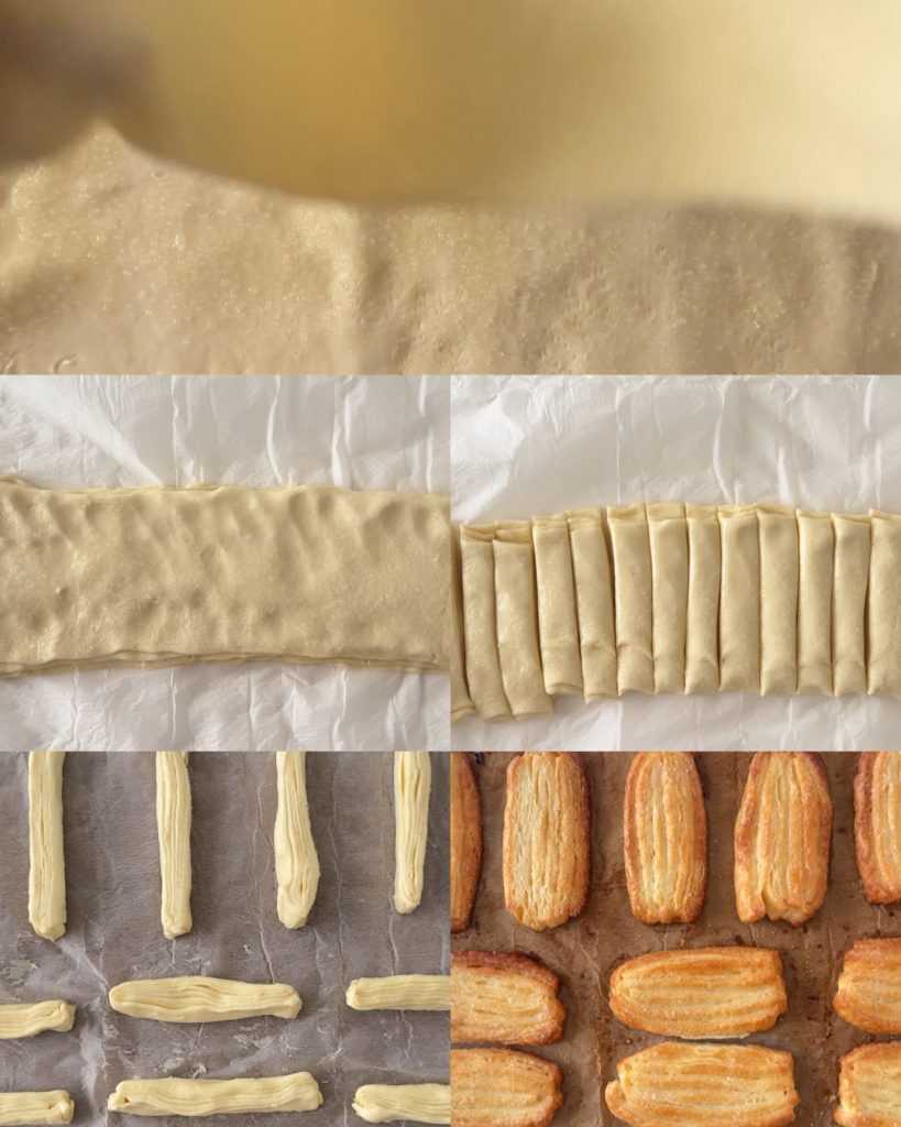 Os biscoitos de massa folhada são super fáceis e rápidos de preparar. Primeiro, desenrole um rolo de massa folhada e pincele um pouco de água sobre toda a superfície. Adicione 2 colheres de açúcar e corte a massa em 3 partes iguais, no sentido horizontal, faça a mesma operação com a outra massa, assim você obterá 6 tiras de massa folhada.