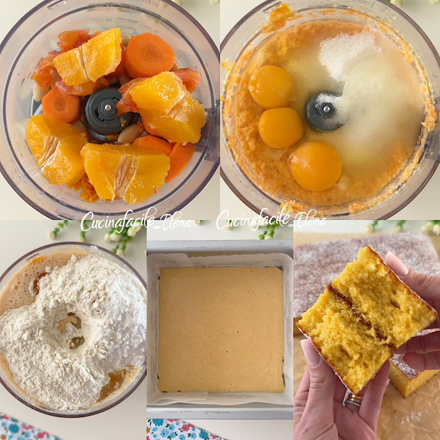 O bolo de laranja, cenoura e amêndoas é muito simples e rápido de preparar, primeiro coloque em um processador as amêndoas peladas, as cenouras descascadas e cortadas em pedaços, a casca ralada de uma laranja e os gomos de laranja, sem sementes.