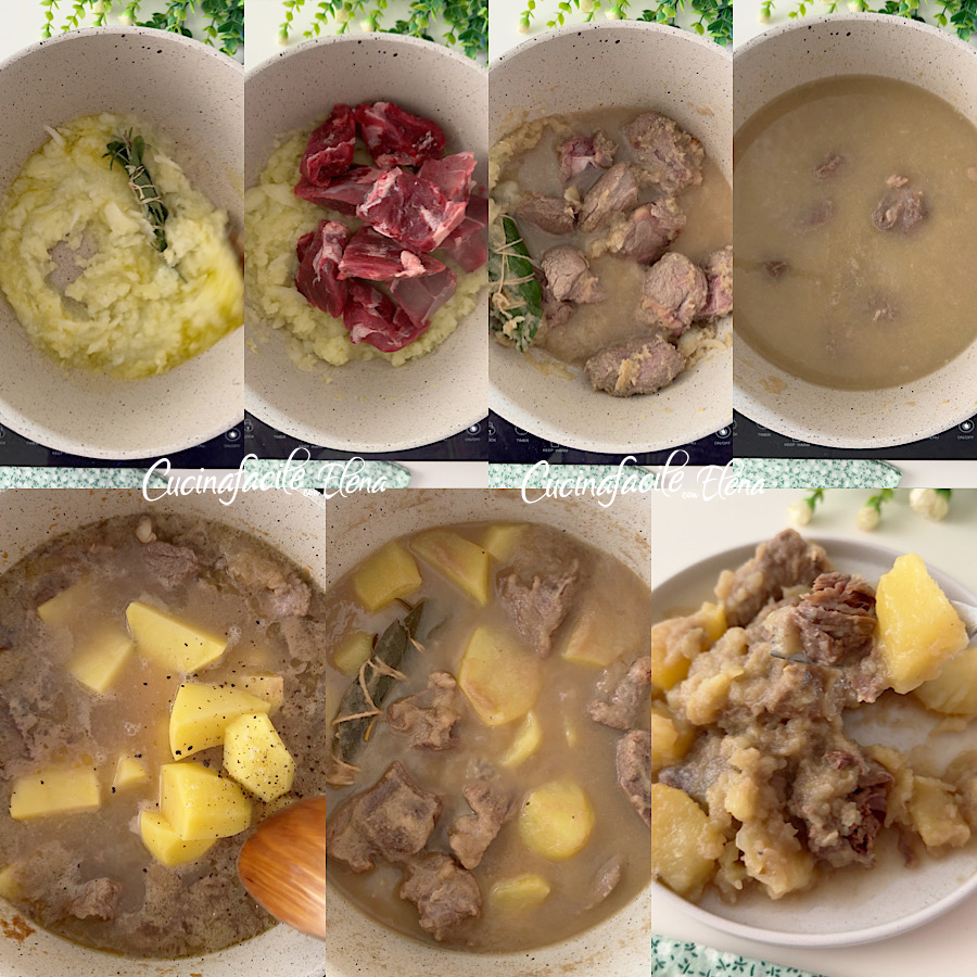 • Adicione a carne cortada em pedaços grandes e deixe fritar por alguns minutos, assim que escurecer, adicione um pouco de sal, regue com o vinho branco e, após alguns minutos, adicione a água (ou caldo de legumes ou de carne), adicione sal e deixe cozinhar por cerca de uma hora (ou até uma hora e meia, se tiver tempo).