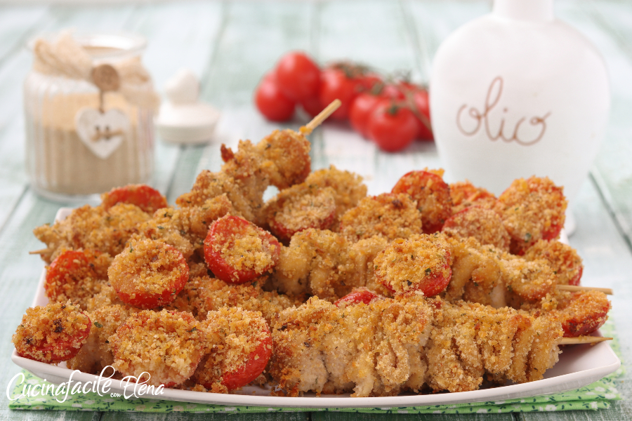 Os espetinhos de frango com tomatinhos assados são um segundo prato com acompanhamento simples, saboroso e delicioso. Eu tinha um pouco de peito de frango cortado em fatias e não estava a fim de fazer os clássicos bifes empanados, então, cortei-os em tirinhas, empanei e espetei nos palitos. Para ter um prato completo, adicionei também alguns tomatinhos que temperei com um pouco de açúcar mascavo, para deixá-los confit. Que delícia! Os espetinhos de frango com tomatinhos assados são macios e saborosos, com a empanada dourada e crocante, sem ovos e sem leite, vão resolver seu jantar em pouquíssimos minutos!