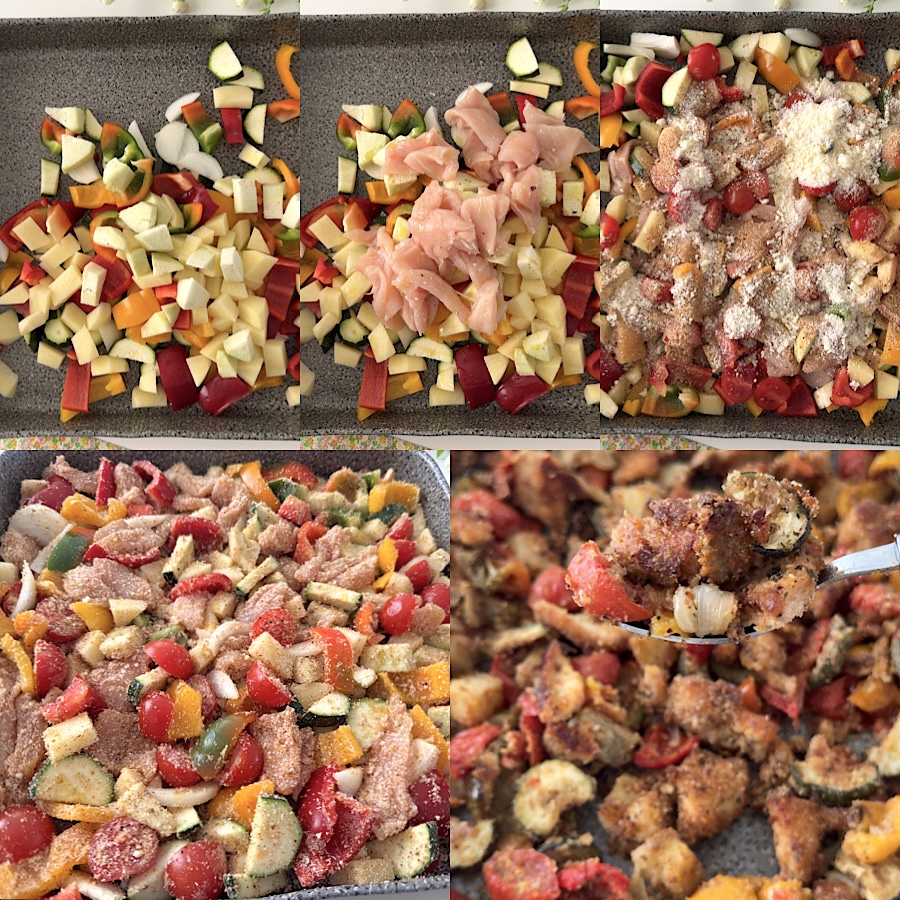 O frango com legumes assados é uma receita rápida, super prática e deliciosa, um segundo prato com acompanhamento que se prepara em pouquíssimos minutos. Eu tinha peito de frango para cozinhar, um bom tanto de legumes frescos para fazer e pensei em preparar um prato único, para toda a família, usando apenas uma assadeira. Exatamente assim, não suje mais nada, você não precisa pré-cozinhar ou escaldar os legumes antes, em poucos minutos e com poucos e simples ingredientes, você trará à mesa um prato super saboroso que agradará até as crianças, muitos pedaços de frango tenros e crocantes, acompanhados de deliciosos legumes crocantes, você pode até cozinhá-los na fritadeira a ar!