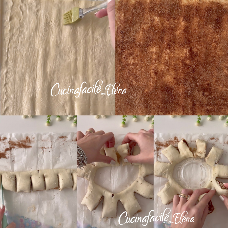 • Dobre a massa formando um círculo, una as extremidades e coloque no centro uma xícara ou uma tigela que possa ir ao forno, apenas para manter a forma durante o cozimento, depois gire os rolinhos para cima.