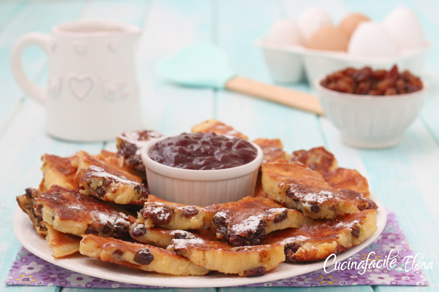 A omelete doce é uma receita do Alto Adige (tirolesa) fácil, rápida, simples e deliciosa. Fazia tempo que queria prepará-la, tinha muitos ovos para consumir e decidi, finalmente, fazê-la para o café da manhã de domingo. Devoramos! A omelete doce é macia e saborosa, é feita com poucos ingredientes e com a uva-passa que a torna ainda mais gostosa, fica ligeiramente caramelizada no final da cocção (se não gostar, pode omitir) e é servida com uma pitada de açúcar de confeiteiro e com geleia de mirtilos ou frutas vermelhas ou silvestres, é nutritiva e deliciosa, ótima também como lanche ou merenda, vai agradar tanto adultos quanto crianças!