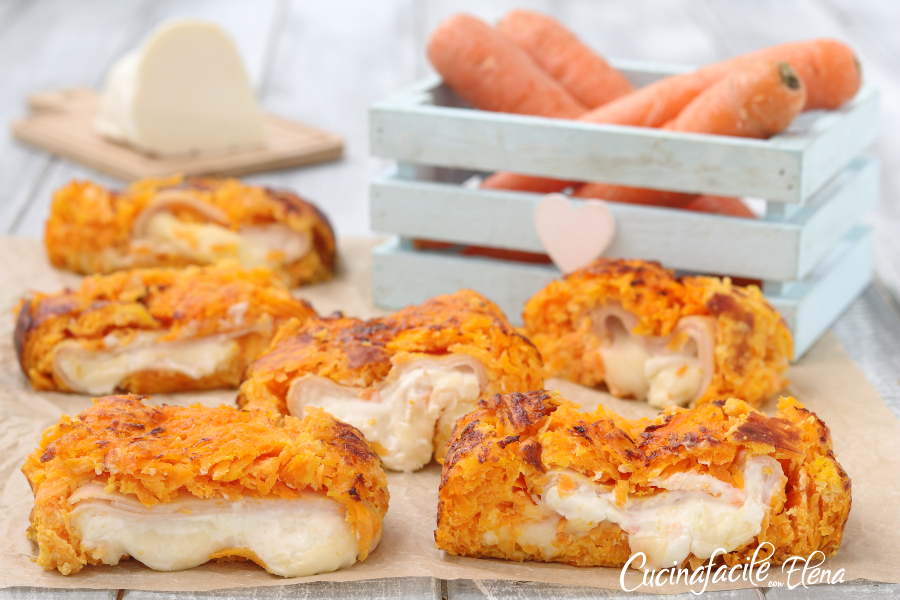 O rolo de cenoura é uma receita à base de legumes rápida, deliciosa e muito saborosa, uma espécie de bolo de carne sem carne. Minha filha Matilde adora cenouras, então pensei em preparar uma receitinha que, como eu imaginava, ela adorou. O rolo de cenoura é um prato principal (mas também é ótimo como aperitivo) macio e com recheio cremoso e derretido, eu coloquei peito de peru, queijo scamorza e queijo cremoso, mas você pode rechear como preferir, é muito bom, vai desaparecer rapidamente!