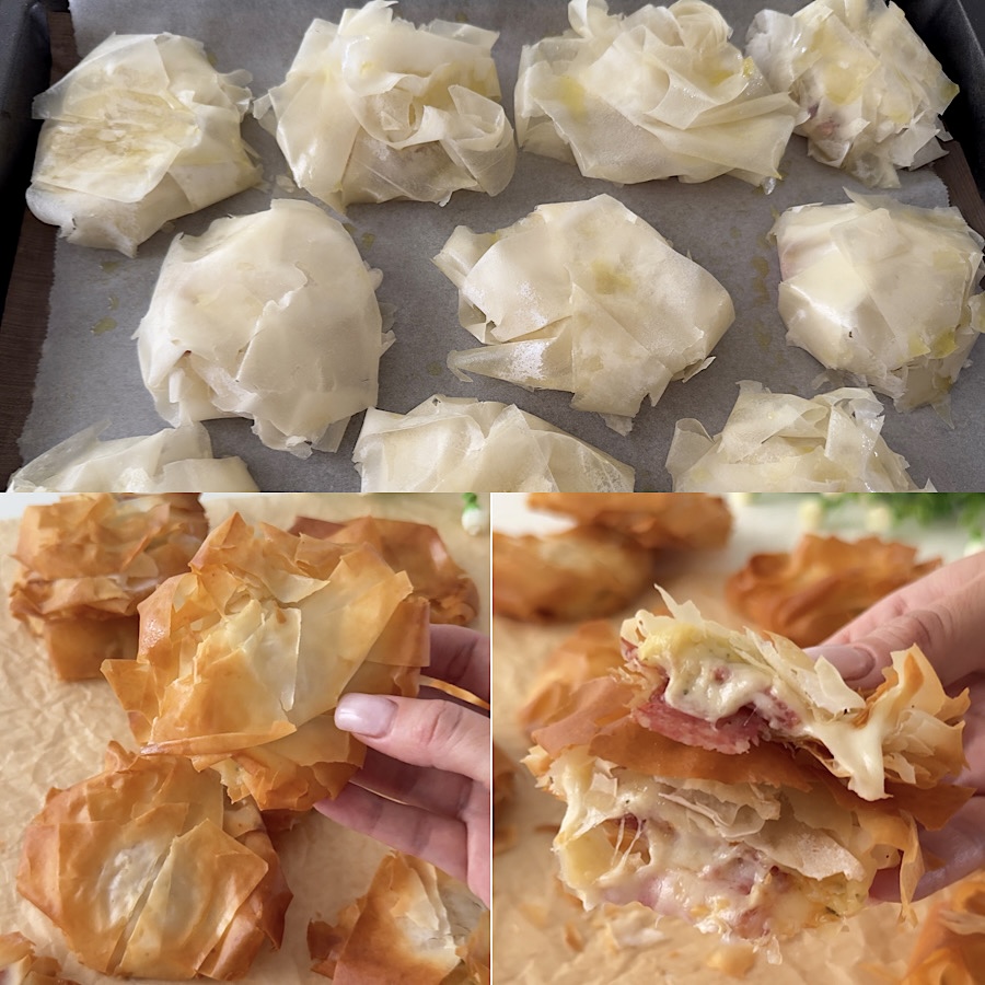 • Recheie o centro com salame e queijo e feche a trouxinha, dobrando a massa filo sobre o recheio.