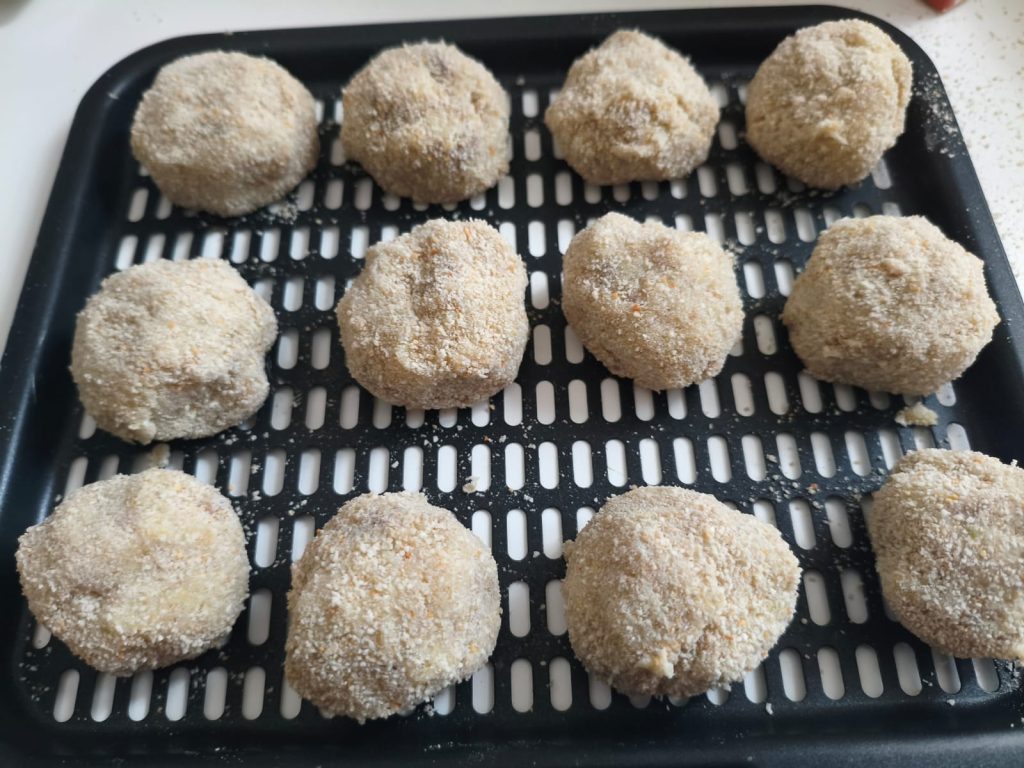 Forme as almôndegas e passe-as na farinha de rosca. Cozinhe na fritadeira a ar a 190° por 15-18 minutos.