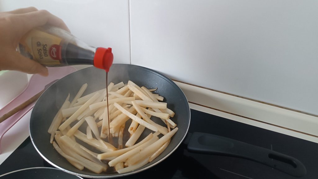 Adicione molho de soja a gosto e meio copo de água.
