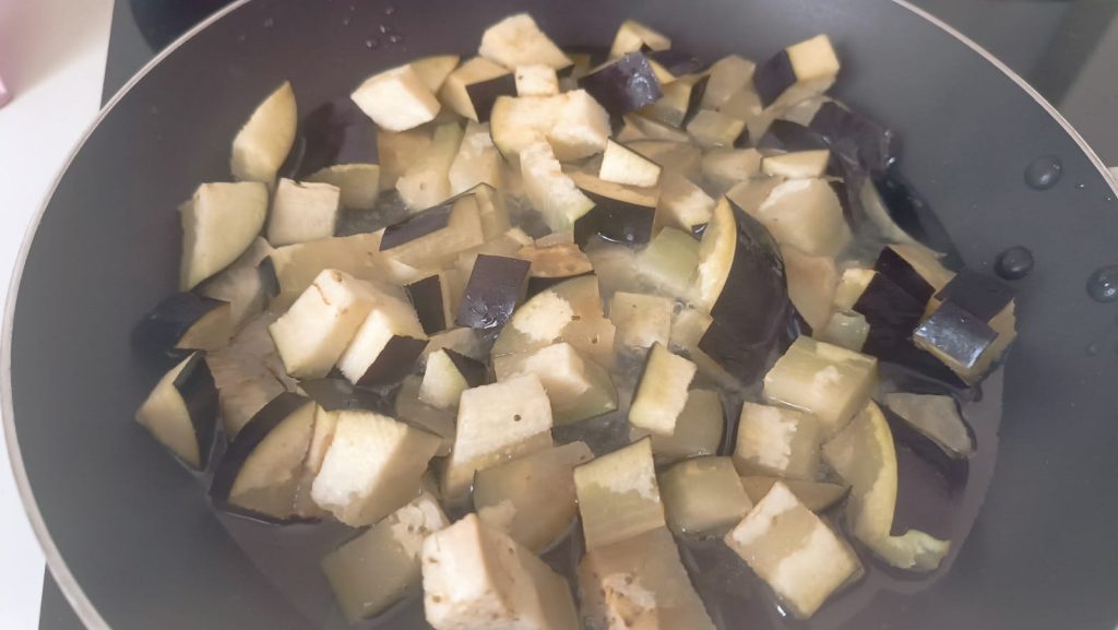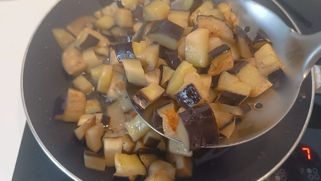 A preparação é rápida e intuitiva: basta cortar as berinjelas em cubos e cozinhá-las na frigideira com óleo. Adicionam-se tomates cereja e, se gostar, uma pitada de pimenta, que dão ainda mais personalidade ao prato.