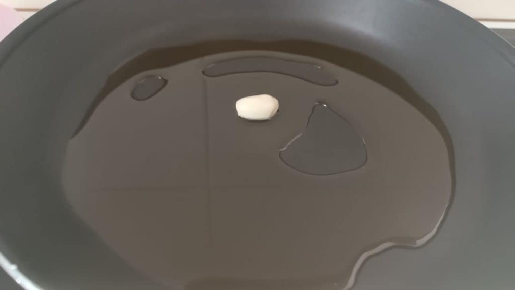 Coloque uma frigideira no fogo com um fio de óleo e doure um dente de alho