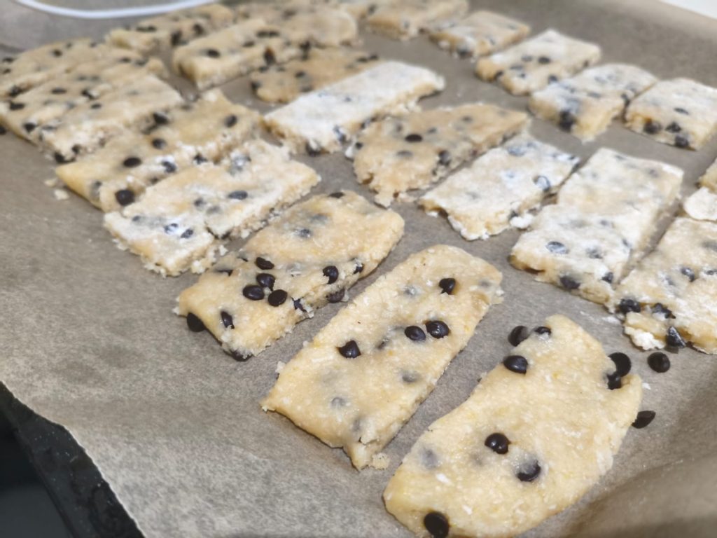 Corte com uma faca as tiras em grandes biscoitos e coloque-os em uma assadeira com papel manteiga.