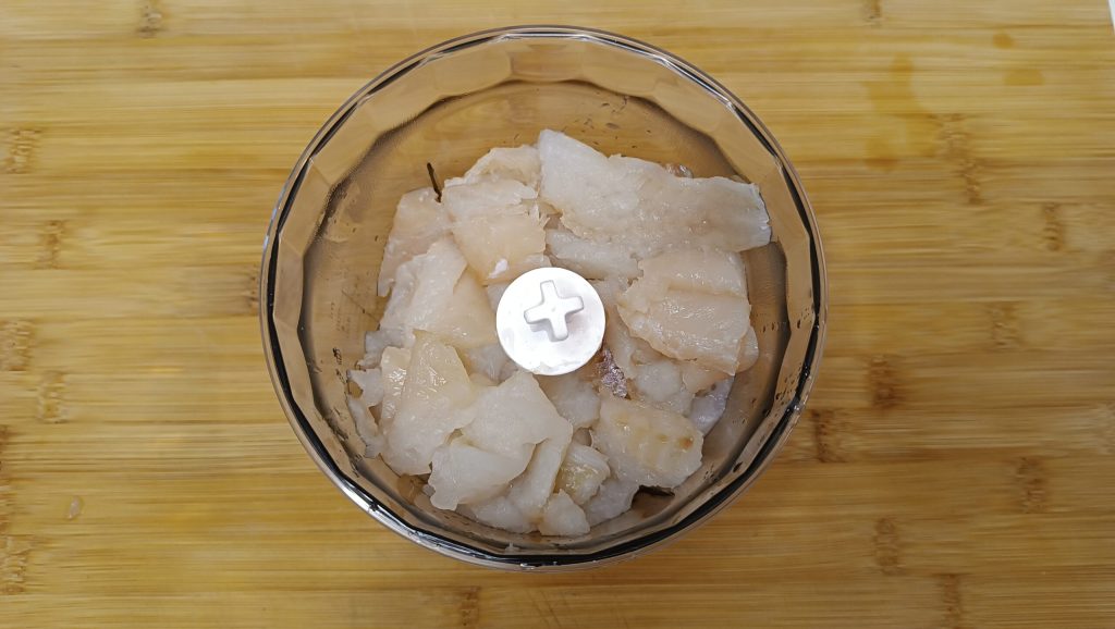 Corte o bacalhau e coloque no liquidificador e bata. Enquanto isso, pique a salsinha e adicione
