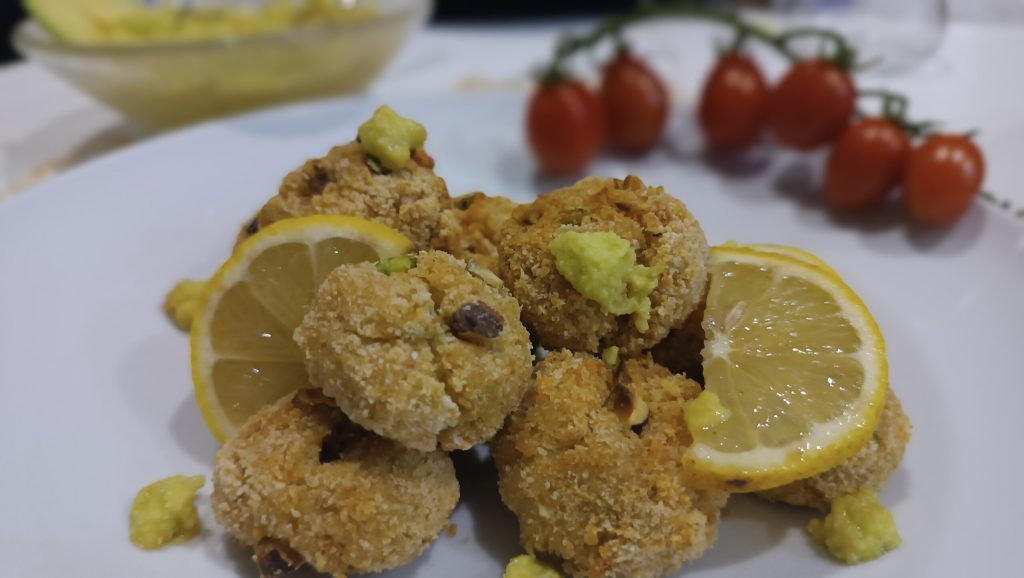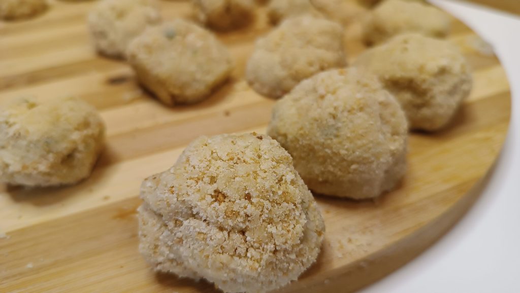 Dê uma primeira empanada nos bolinhos, depois adicione os pistaches na farinha de rosca e dê uma segunda empanada.