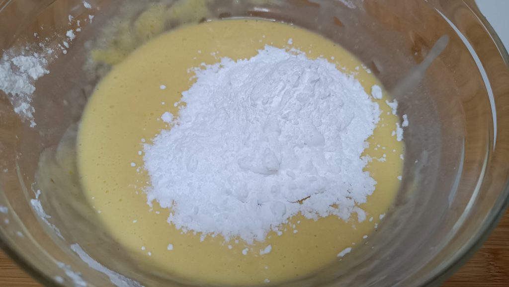 • Adicione a fécula junto com o fermento, a farinha e a casca ralada do limão
