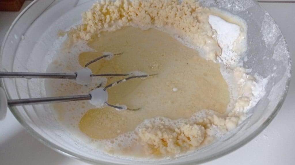 Junte o leite sem lactose e o óleo e bata com as batedeiras elétricas para obter uma mistura arejada e homogênea sem grumos.