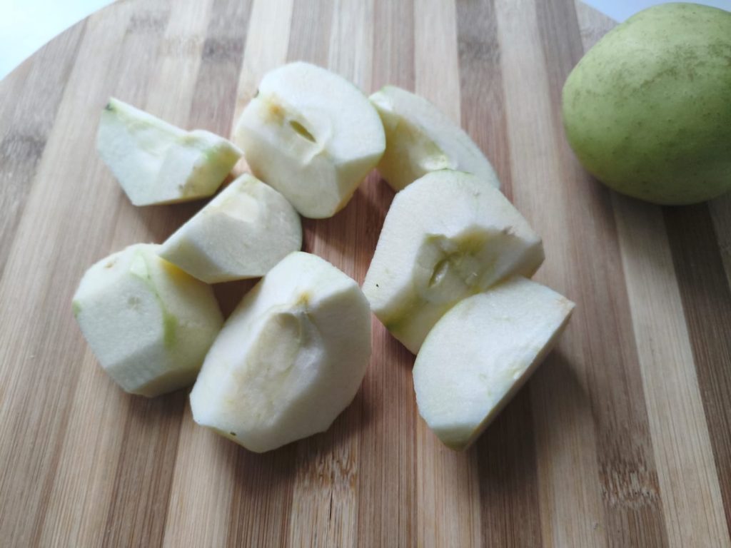 • Prepare as maçãs: descasque uma maçã e bata com o leite até obter um creme liso.