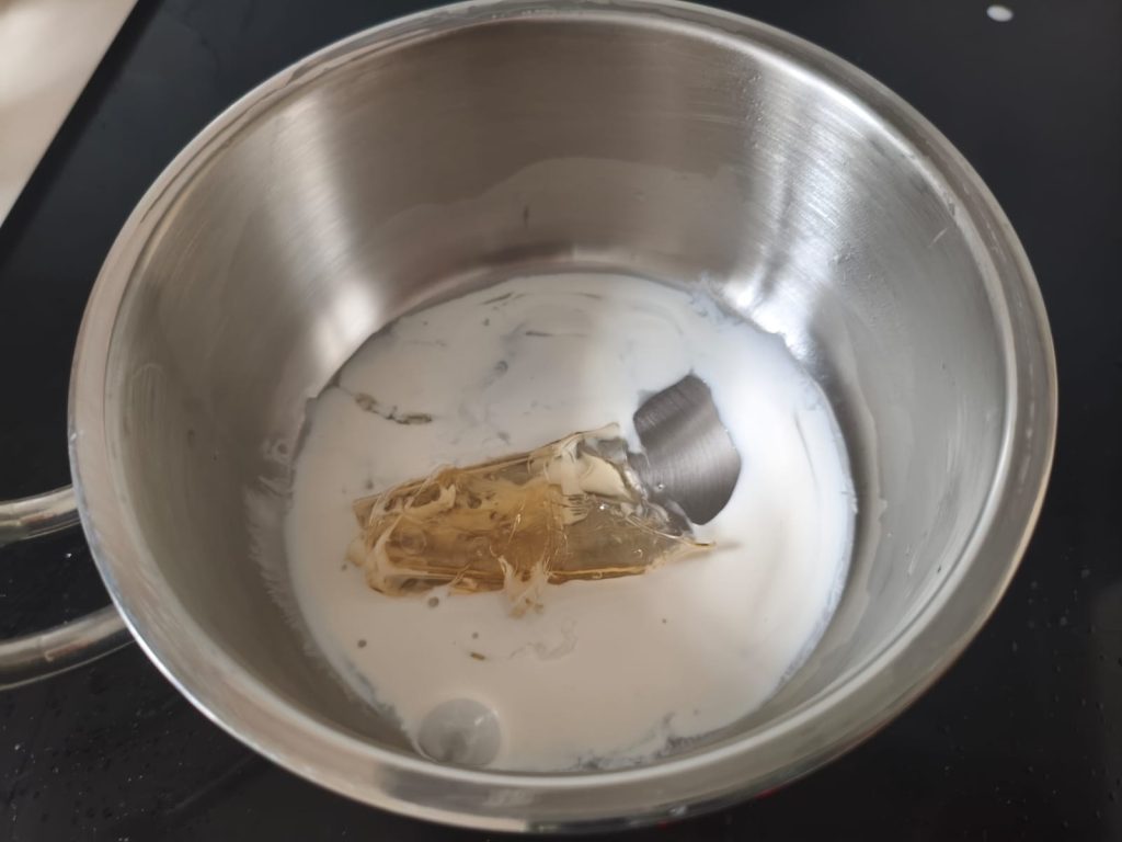 Coloque duas colheres de creme de leite em uma panelinha, aqueça e dissolva a gelatina.