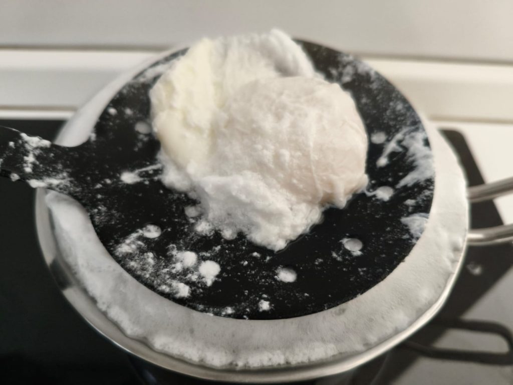 Prepare os ovos poché: coloque uma panela com água no fogo, quando começar a ferver, adicione o vinagre e o sal. Em seguida, com uma colher, mexa na mesma direção para criar um vórtice e quebre o ovo no centro.