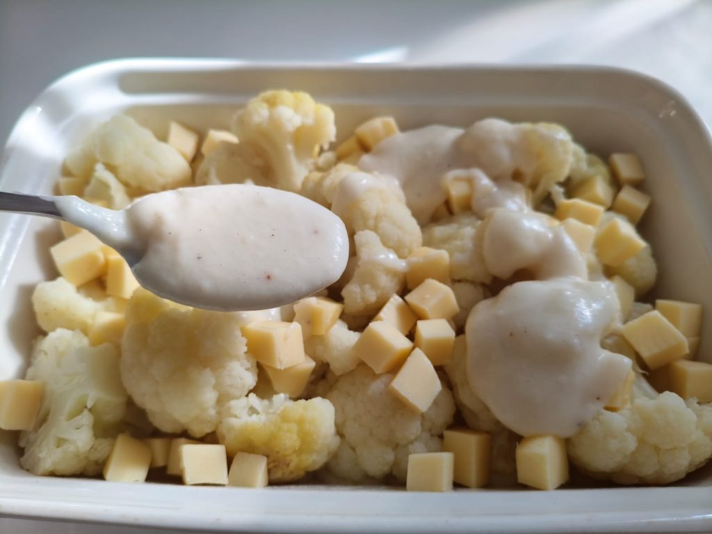 Corte o galbanino em cubos. Pegue um refratário, coloque algumas colheres de molho bechamel no fundo e adicione os floretes de couve-flor, os cubos de galbanino e o molho bechamel.