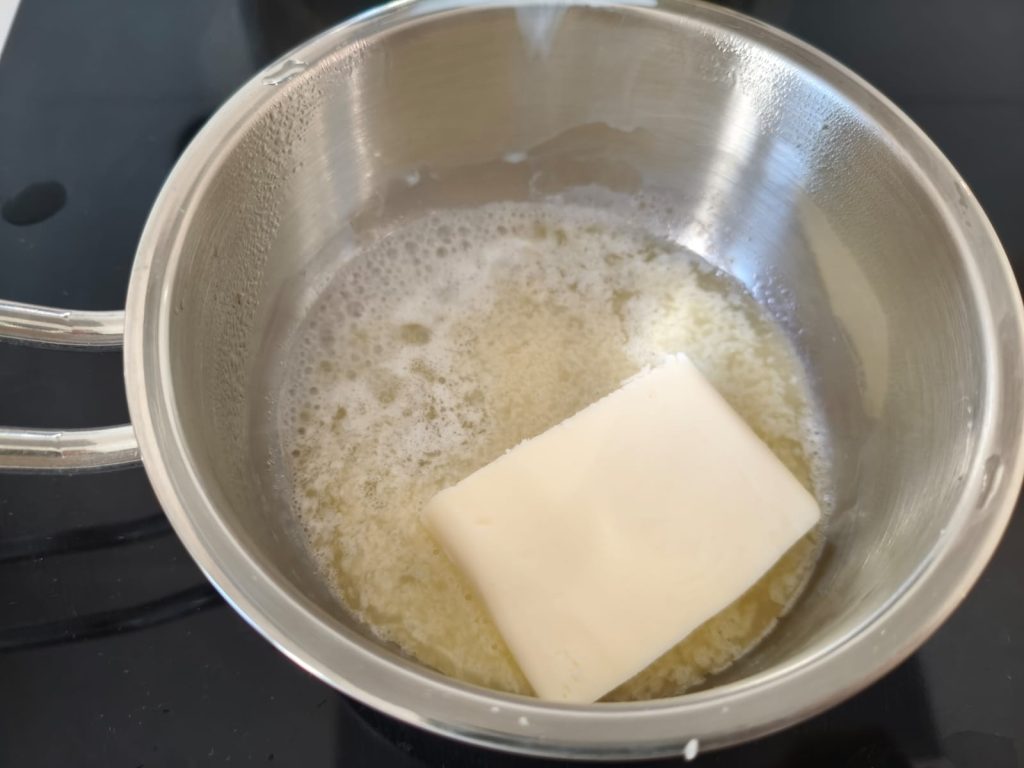 Enquanto isso, prepare o molho bechamel: Coloque a manteiga em uma panela em fogo baixo e derreta.