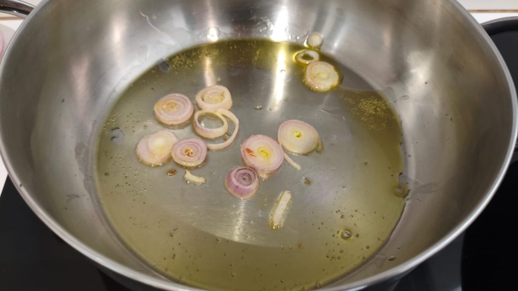 Em uma panela, cozinhe em um fio de azeite a chalota finamente fatiada e adicione a couve.