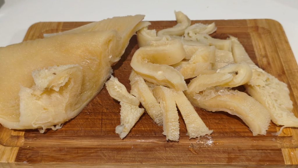 Enquanto isso, corte a dobradinha em tiras e depois adicione-a ao molho. Cubra e cozinhe a dobradinha na sua própria água. Misture e adicione salsinha picada e ajuste o sal.