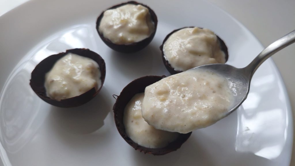 Assim nasceu esta sobremesa: as esferas de chocolate meio amargo com coração de sorvete de kefir e banana.