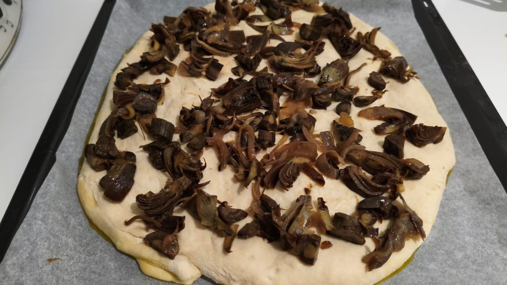 Após uma fermentação adequada, a focaccia é enriquecida com alcachofras salteadas que conferem um sabor irresistível e uma consistência perfeita.