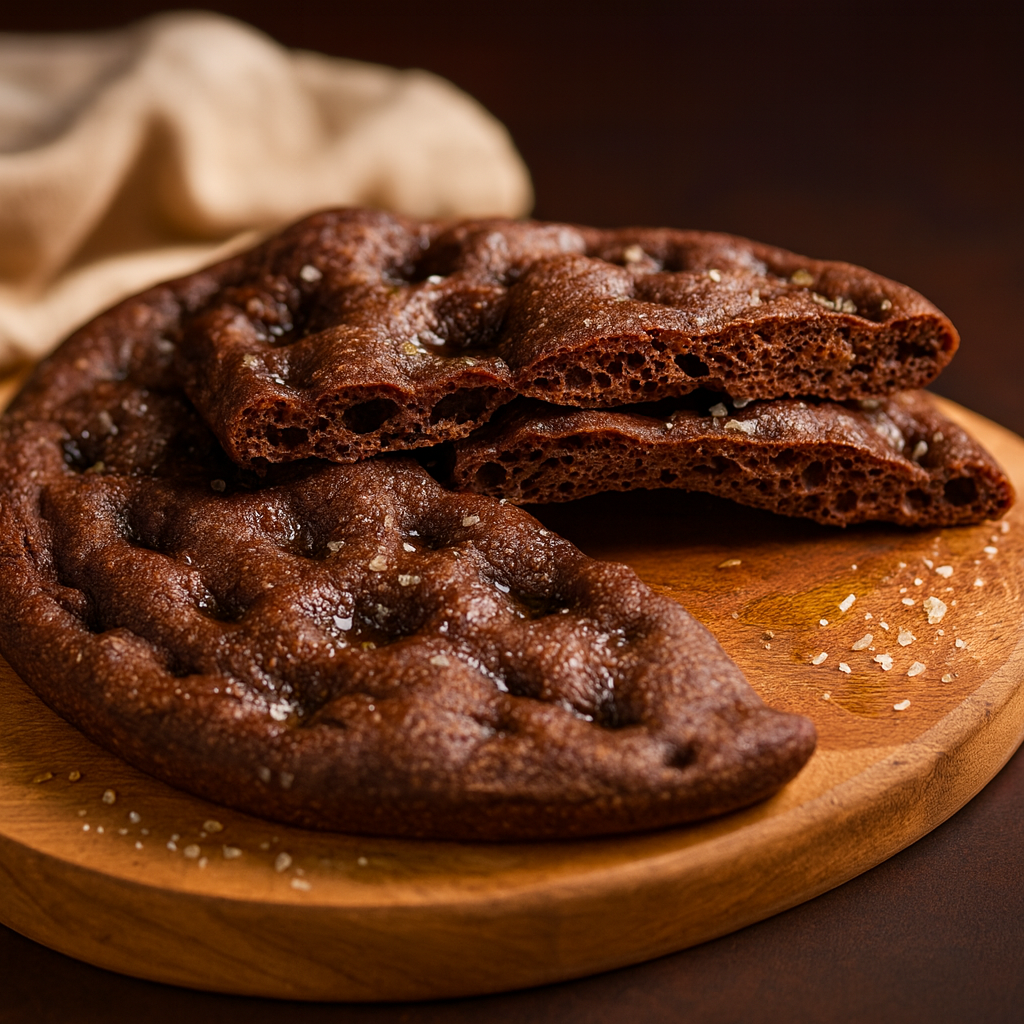 Imagine o aroma da focaccia recém-saída do forno, com aquela crosta dourada e macia por dentro, enriquecida por um toque de cacau amargo que oferece um sabor único e refinado. É uma receita especial para buffet, jantares entre amigos ou aperitivos elegantes, pois une a tradição da focaccia italiana com um ingrediente que normalmente associamos a doces.