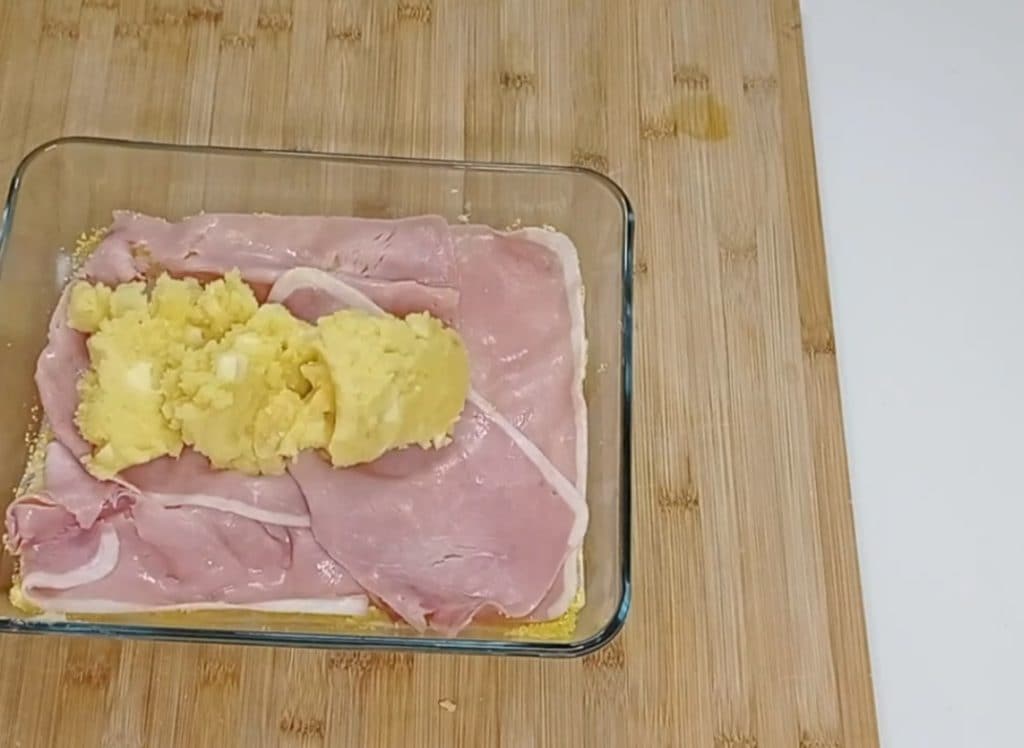 Coloque o presunto cozido e cubra fazendo o segundo estrato