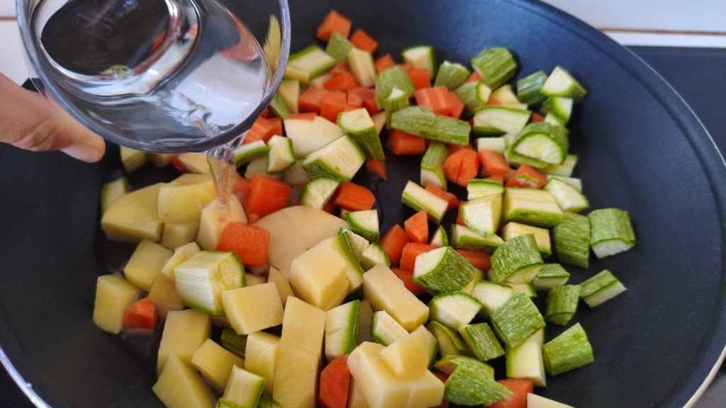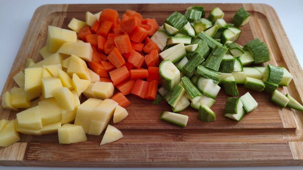 Para fazer os hambúrgueres vegetais, comece lavando os vegetais e cortando-os em cubos