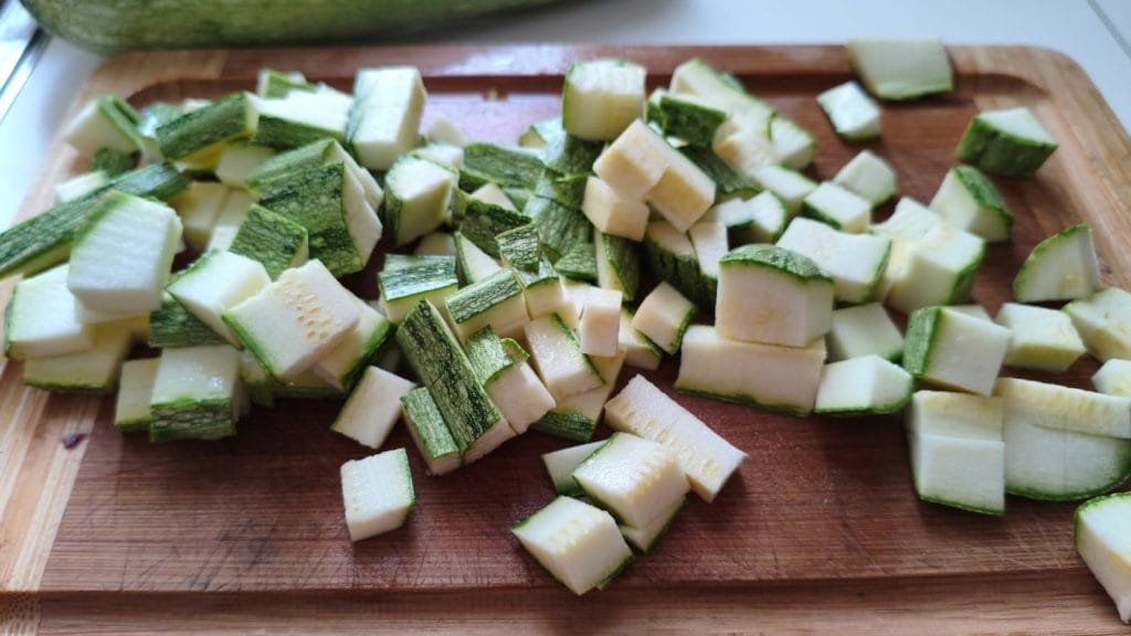 Para preparar as lasanhas de abobrinha e linguiça, comece cortando as abobrinhas em cubos. Em uma frigideira com um fio de óleo, cozinhe a cebola roxa por alguns minutos e adicione as abobrinhas.
