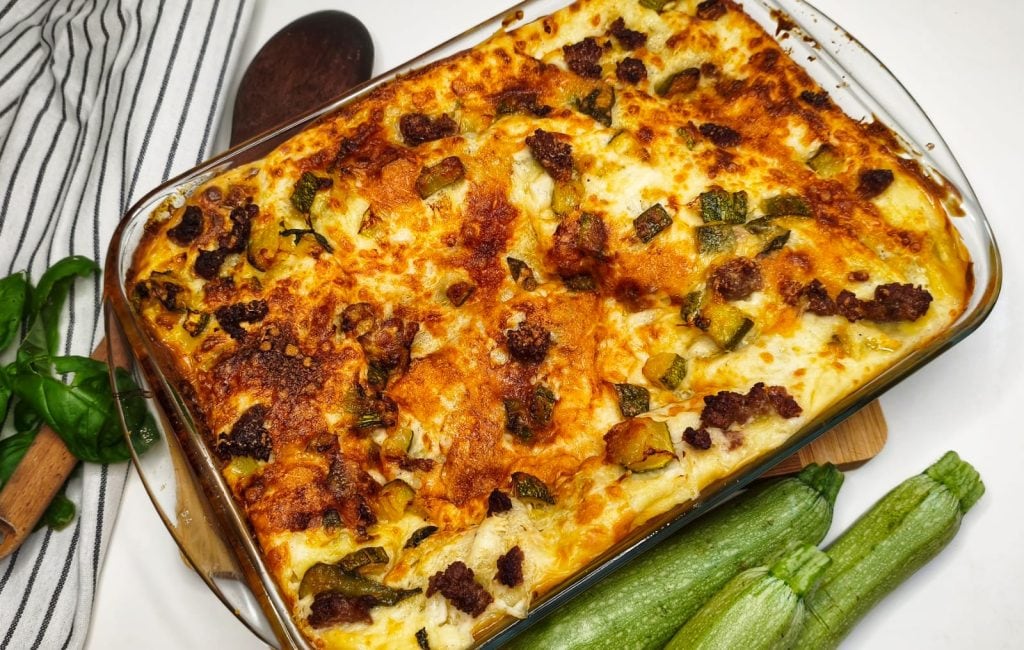 A preparação é realmente simples: basta cortar e cozinhar as abobrinhas, dourar a linguiça e alternar as camadas com molho bechamel e queijo.