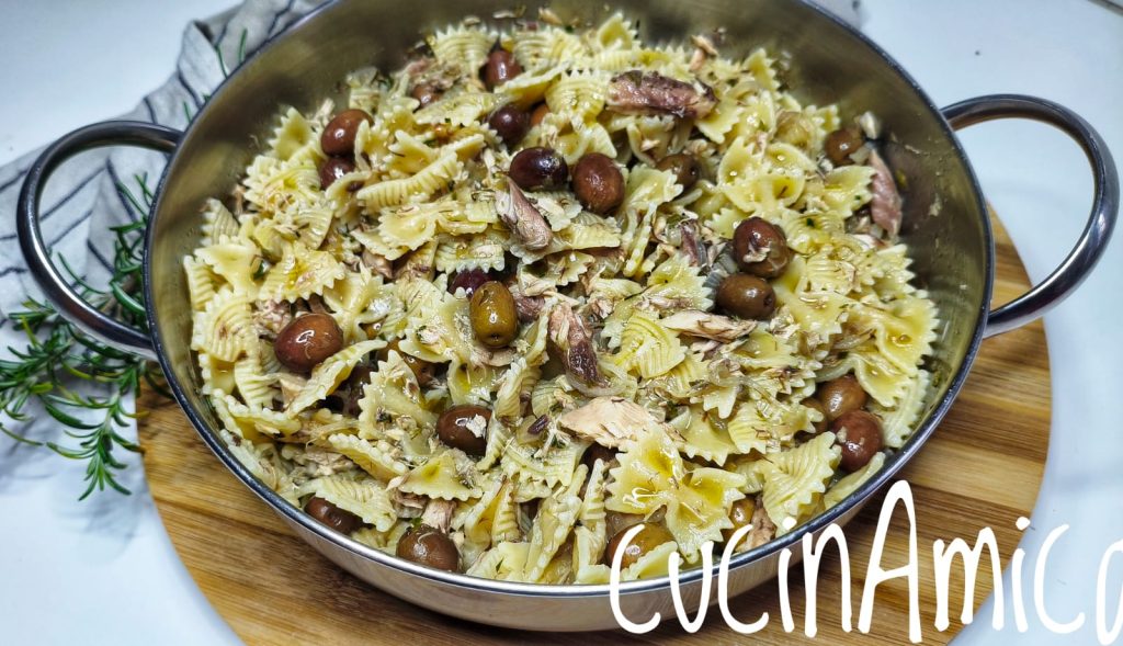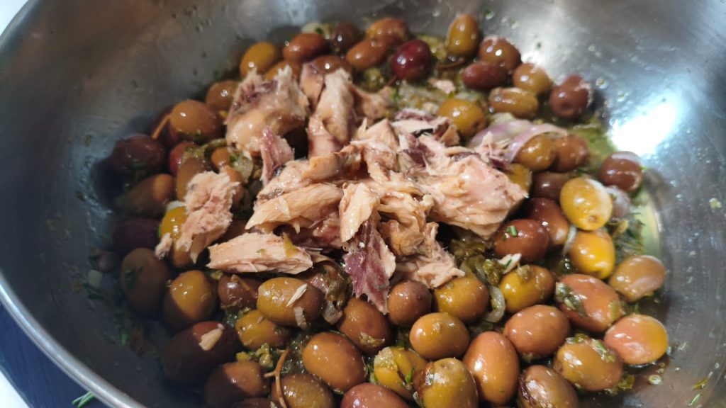 O macarrão com cavala, cebola e azeitonas está pronto!