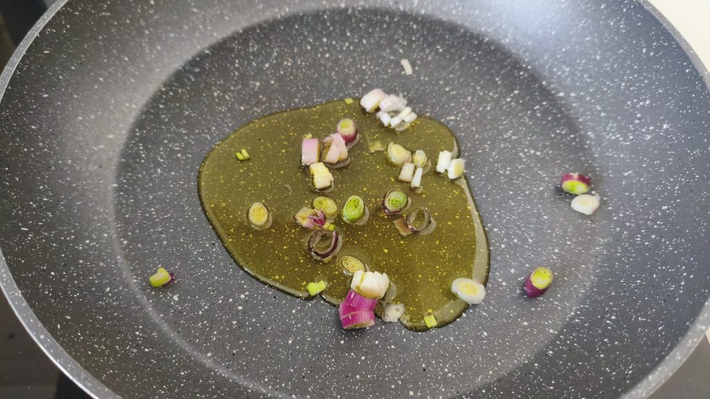 Em uma frigideira aqueça um fio de azeite com a cebolinha picada. Adicione as favas restantes e o atum escorrido. Refogue por alguns minutos para pegar sabor.