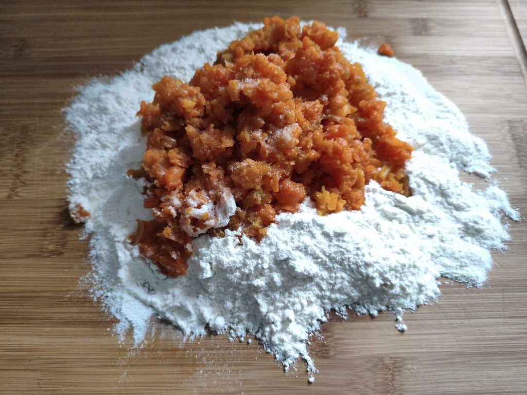 Em uma tábua de corte, adicione a farinha e coloque o purê de cenoura, uma pitada de sal e um pouco de noz-moscada se gostar. Misture até obter uma massa macia, mas trabalhável.