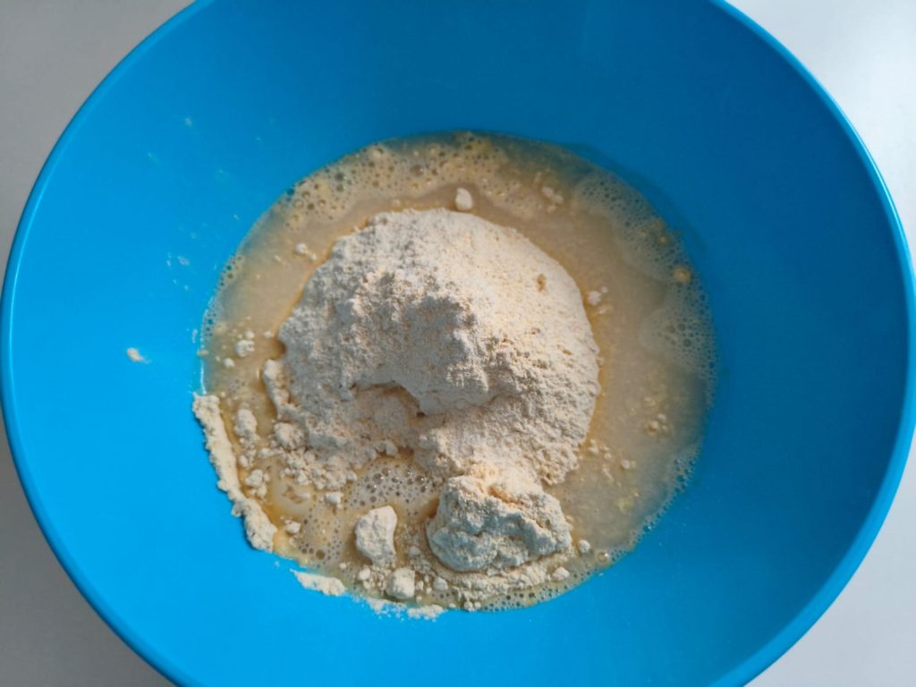 Transfira a massa para uma superfície levemente enfarinhada com farinha de grão-de-bico e sove brevemente para homogeneizar.