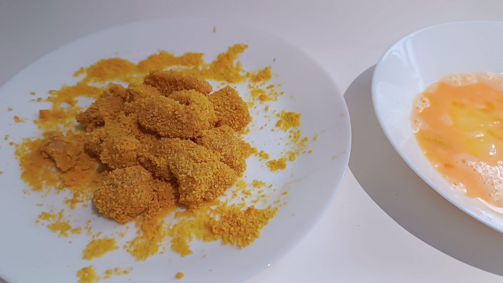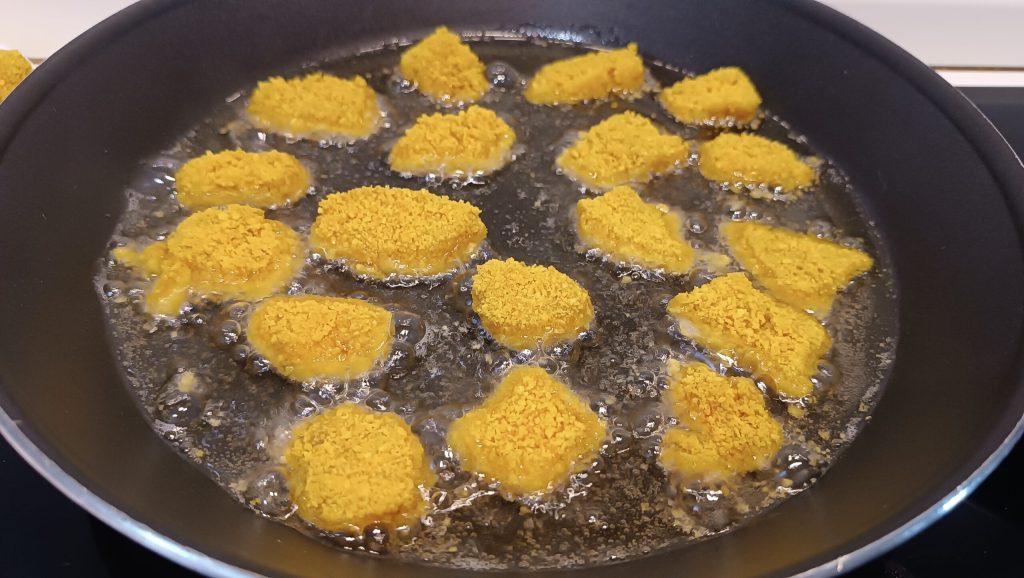 Em uma frigideira, aquecer o óleo e fritar os nuggets.