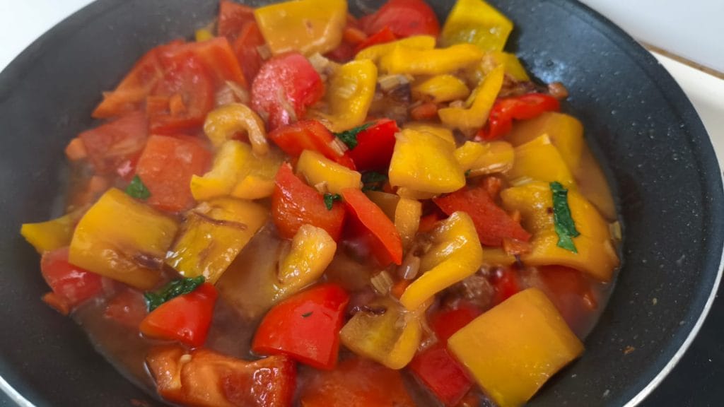• Adicione na frigideira os pimentões cortados e deixe cozinhar, se necessário, adicionando meio copo de água.