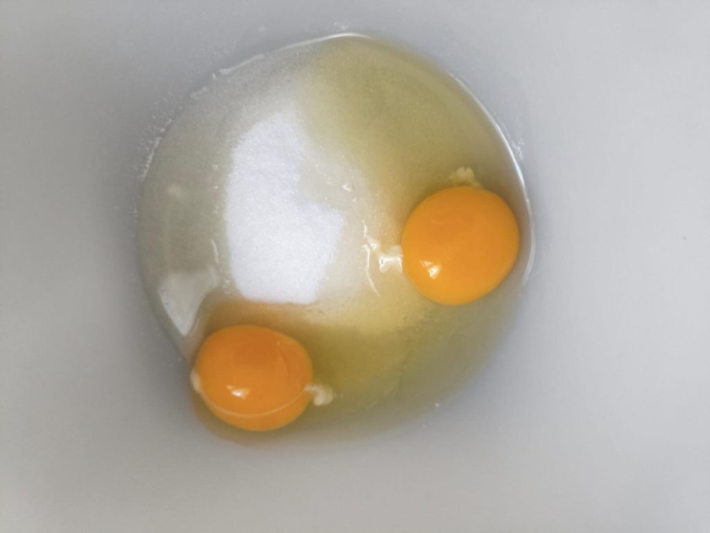 Bata os ovos com o açúcar até obter uma mistura clara e espumosa. Adicione o óleo e o leite de aveia.