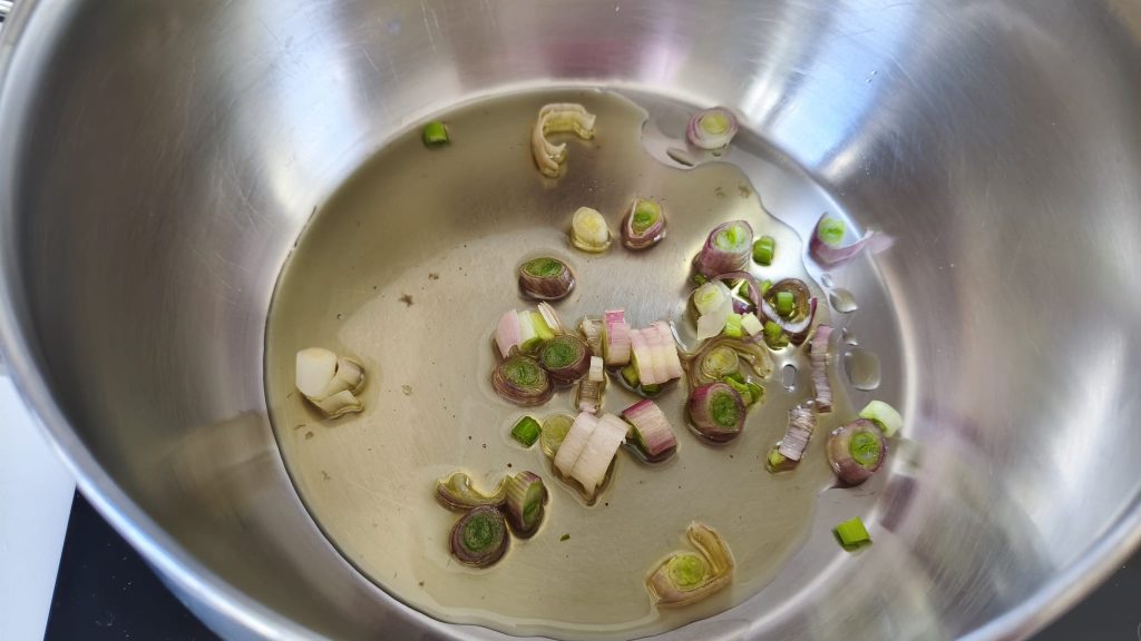 Em uma panela, aqueça um fio de azeite e refogue a cebola em fogo baixo até ficar translúcida.