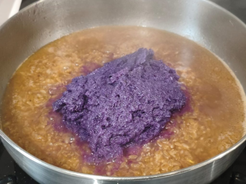 No meio do cozimento, incorpore o creme de repolho roxo e continue a cozinhar até que o arroz esteja al dente e cremoso.