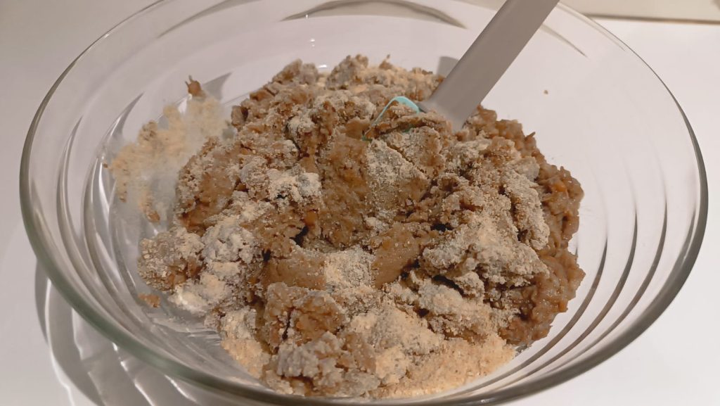 Em uma tigela, adicione as lentilhas e misture a farinha de rosca e o sal.