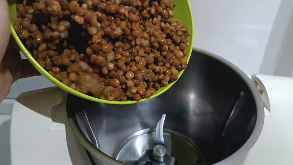 Coloque as lentilhas com os ovos no liquidificador e bata.
