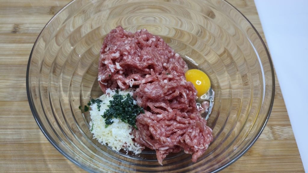 Em uma tigela, coloque a carne e adicione o parmesão, a salsa, o ovo e o sal